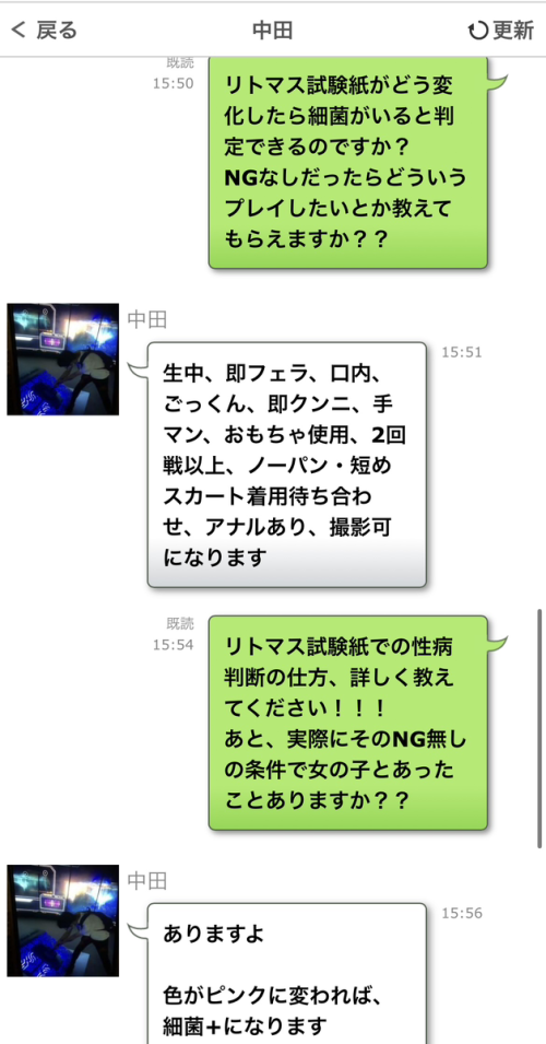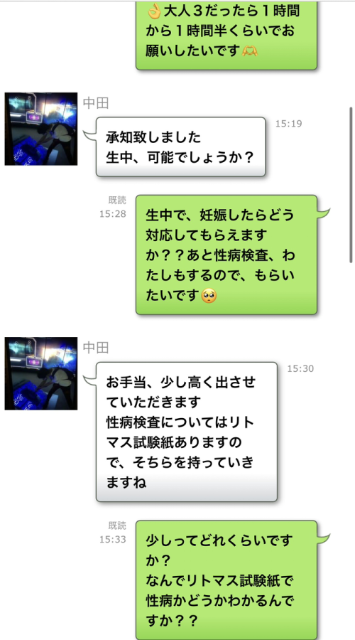 生中でいいか聞かれたから、妊娠した時の対応を聞いて、あと性病検査してほしいって言った。そしたら「お手当を少し高く出す」って言われて性病検査については「リトマス試験紙でやる」って言われた。リトマス試験紙って、液体のphを検査するものだから性病とかわからなくない?こいつ、こうやって言っていつも女の子のことだましてるのかなって思ったら気持ち悪くなってきちゃった。このあたりからわたしも「なめんなよ」って態度取っちゃってるけど、リトマス試験紙で性病検査とか言われたら馬鹿にされてるとしか思えない。