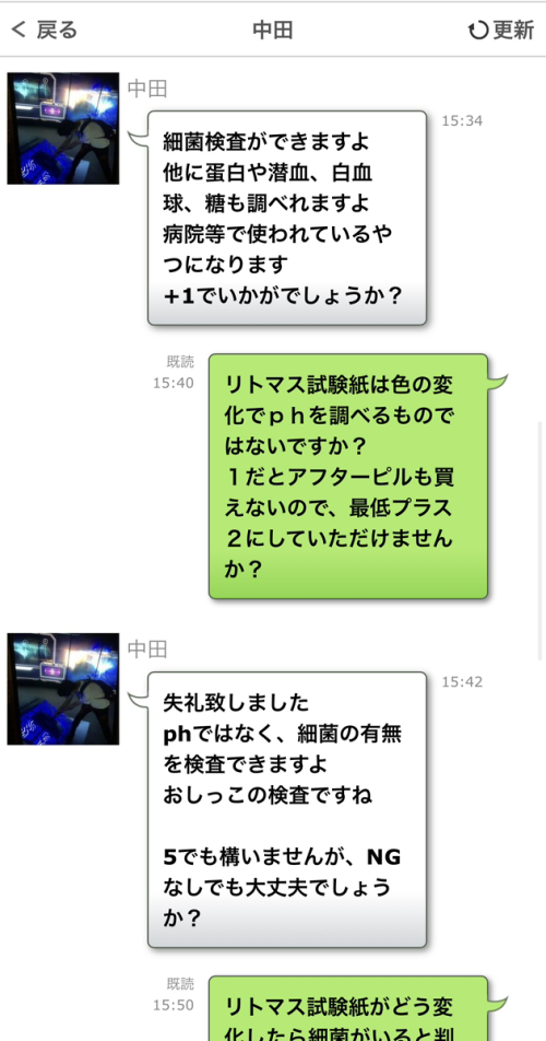 私が、リトマス試験紙はphを調べるのでは?って聞いたらなんか謝ってきたし、アフピル代にもならないから生中なら最低プラス2はしてほしいって言ったら「それならNGなしにしろ」って言われた。