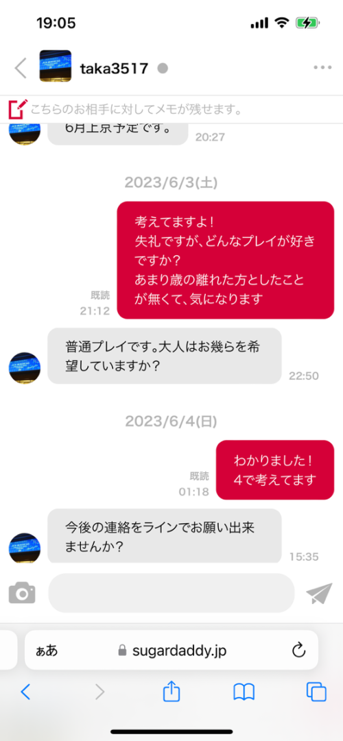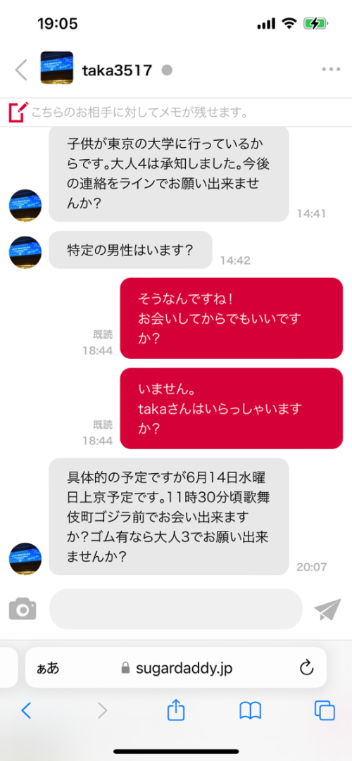 元々石川に住んでて東京に引っ越してくるらしい。大人はいくら希望か、ラインは交換できるかを聞いてきたから4でラインは会ってからって言ったのに、ゴム有なら3でいいかとか、またライン聞いてきたり、めっちゃいらつく(笑)