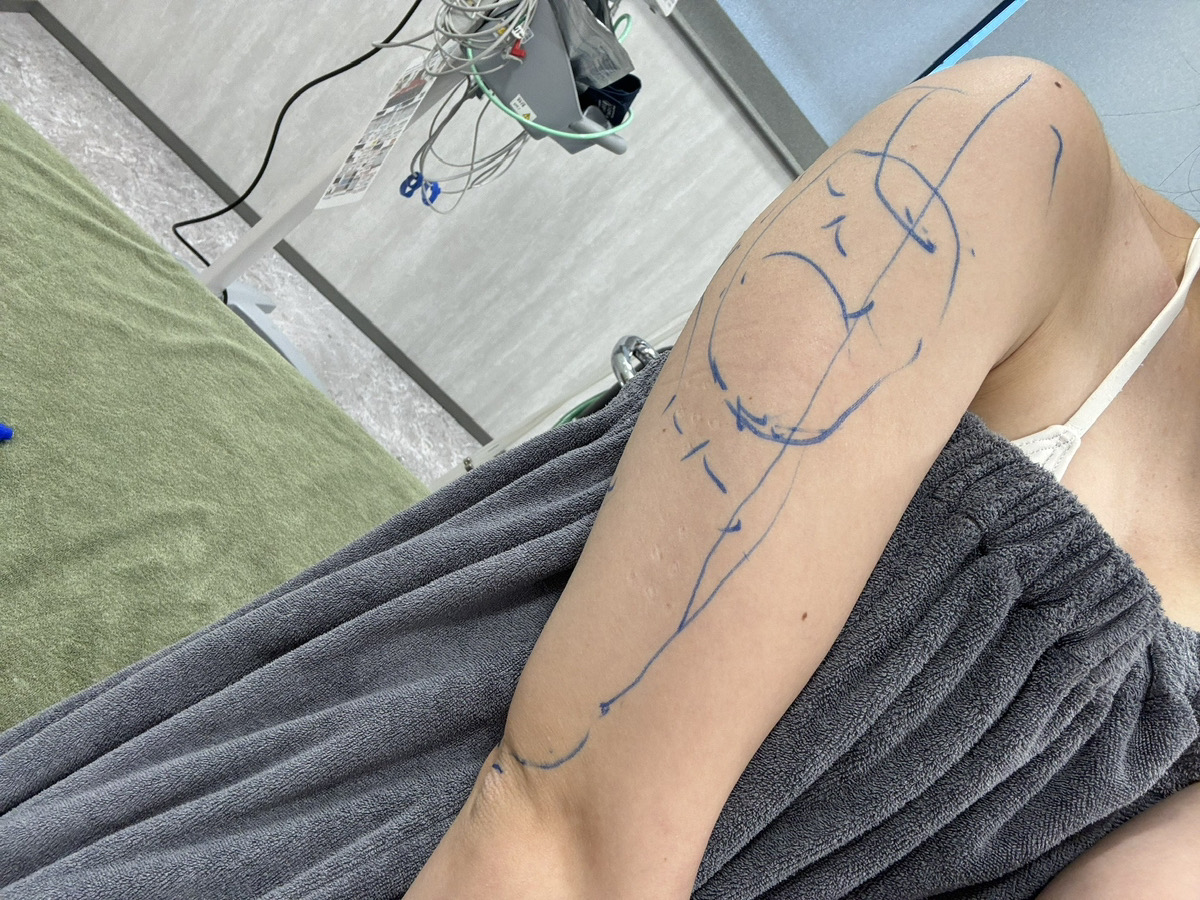 手術を決めた理由は二の腕の太さがずっと気になってて、ダイエットをしても二の腕はまったく細くならない。夏場に腕出してると恥ずかしいし、いつも気になって嫌な気持ちになっていたので脂肪吸引を決めました。 カウンセリングには2つ行ったけれどどこが良いのか全然わからなかったので、友達が脂肪吸引をして良かったと聞いたクリニックに決めました。 当日、緊張したけれどみんな優しくて良かったです。 カウンセリングして、写真のようなデザインを書いて、麻酔。 気づいたら終わってたので痛みはほぼ無かったです。 術後は筋肉痛のような痛みで腕がパンパンに腫れました。 3日くらいは腕を上げるのが辛くて痛みもあります。 1週間してもちょっと痛む。脂肪吸引は大変って聞いてたけど思ってた以上に痛みが続きました。 1か月くらいして見た目が完成してきた。明らかに腕が細くなったし、違和感もない。 コンプレックスだったので脂肪吸引して良かった。ただ、調べて知ってはいたけど圧迫着とかマッサージとか地味に大変。痛みも長く続くので。脂肪吸引したいって願望が強ければ問題ないのでオススメです。